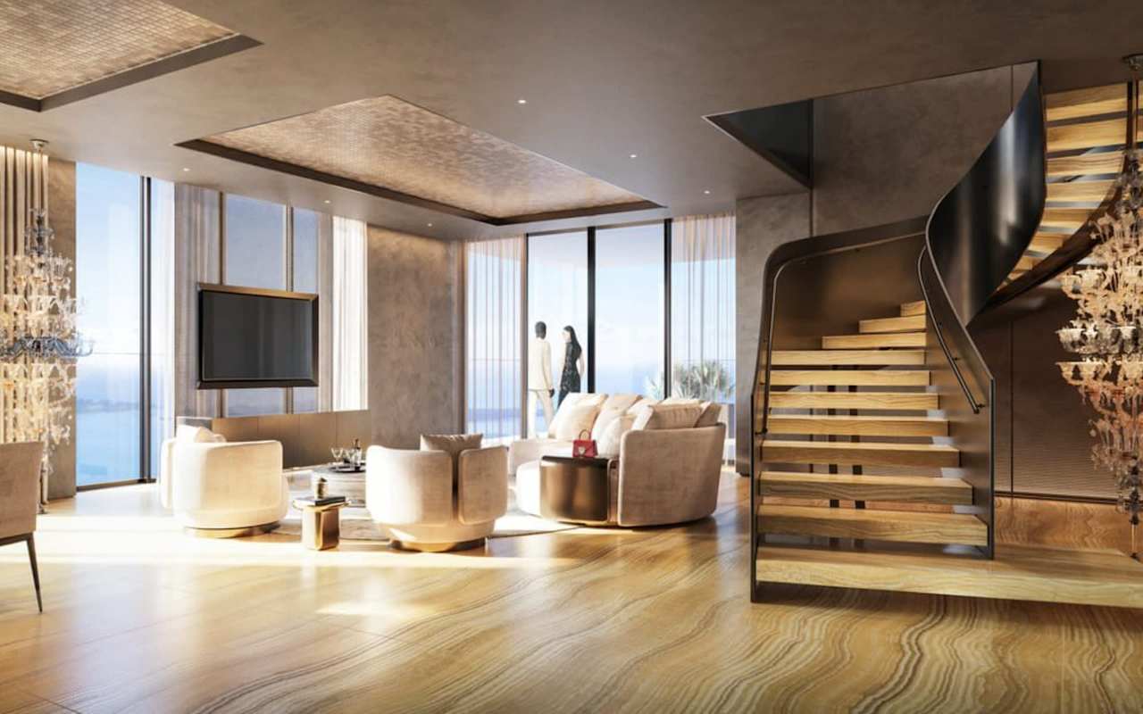 Taking over the skyline, rising high above the recent renaissance of development in Brickell, 888 Brickell Avenue soars to an impressive 1,049 feet tall—marking a new record height for Miami and a category of its own. The façade features an elegant and restrained combination of ivory travertine, white stucco, and matte black steel beams that give the building an expressly vertical appearance, setting it far apart from its neighbors. Towards street level, the building dons a gold beaded “necklace” that brings a warm luster and brilliant shine to the property. Inspired by quintessential modernist skyscrapers like the Seagram Building in New York and Milanese mid-century design and fashion, 888 brings its brand of striking and bold architecture to Miami.